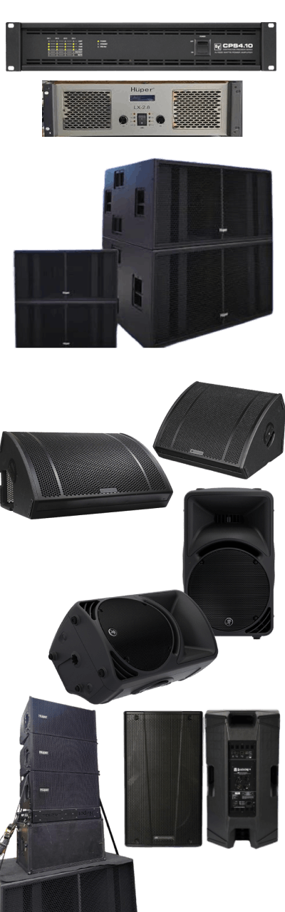 Kami memiliki set lengkap untuk sound system mulai dari Speaker, Subwoofer, Speaker Monitor, Mixer, Microphone, Power, peralatan musik dan peralatan lainnya yang dapat mendukung acara anda.